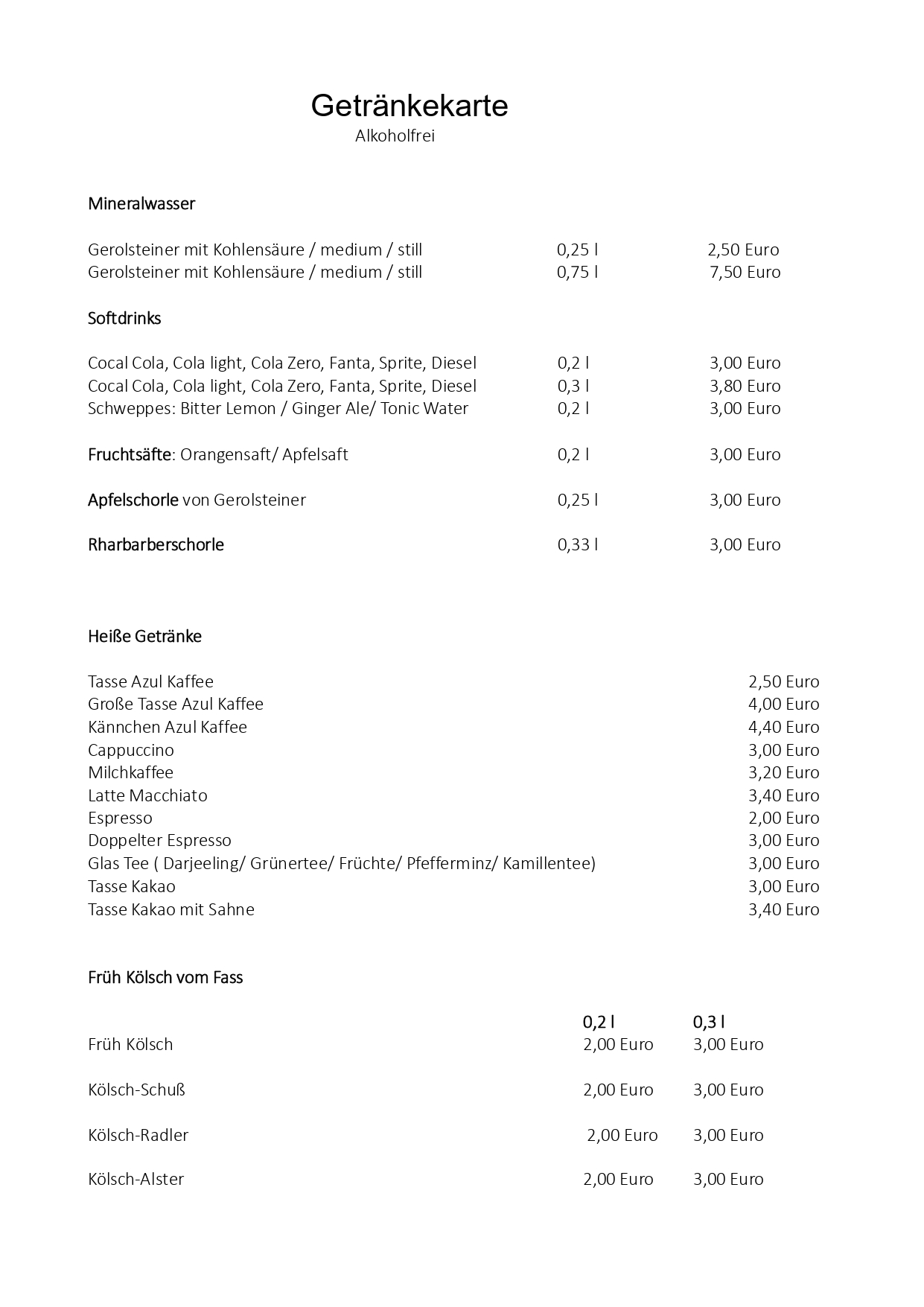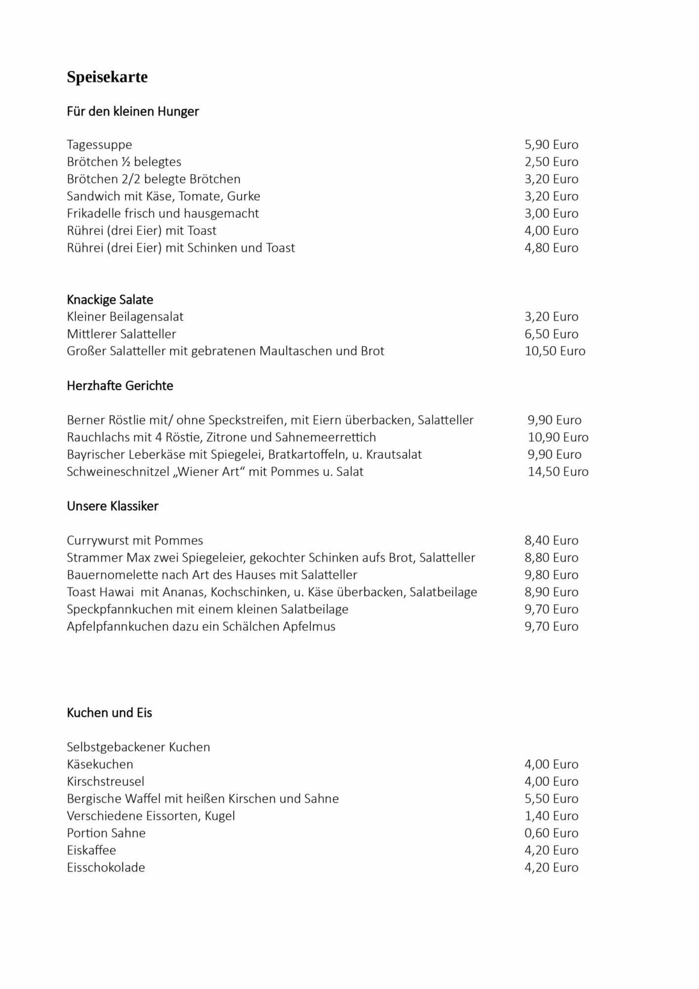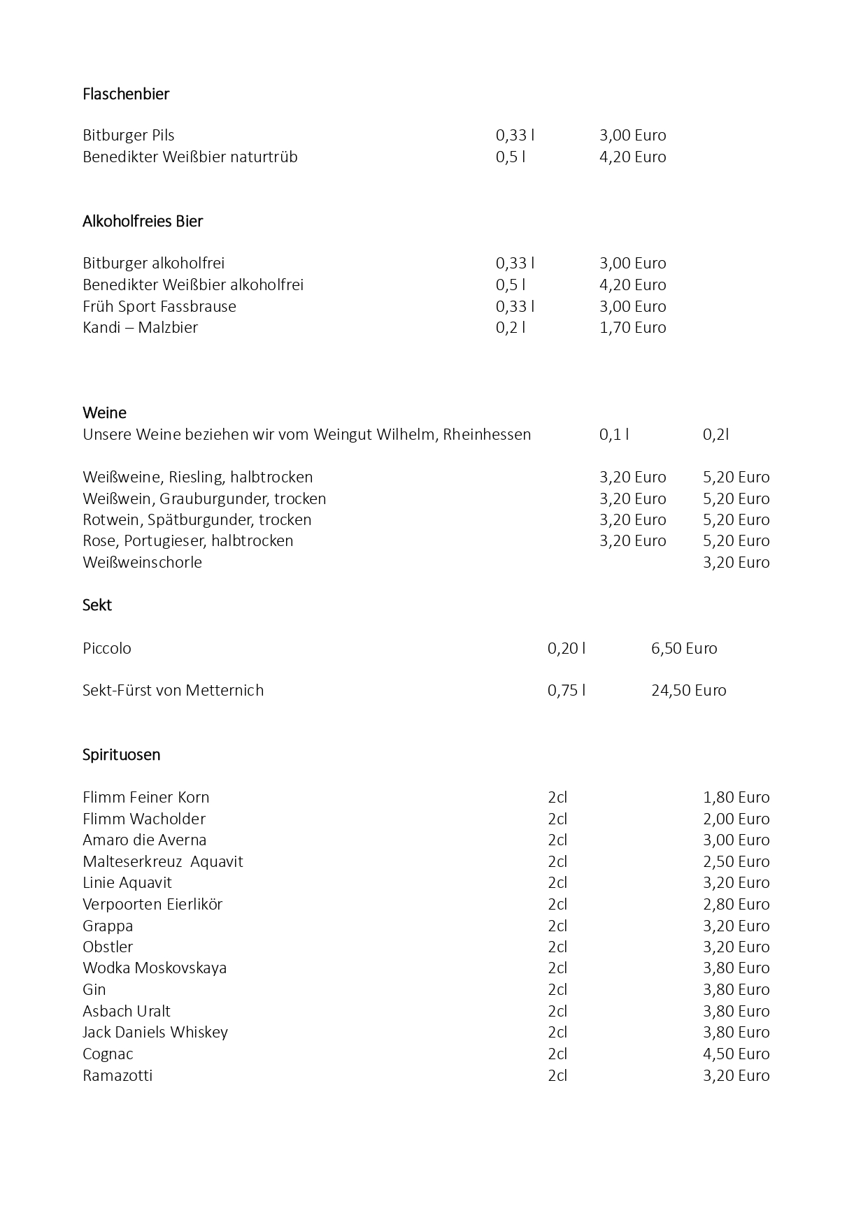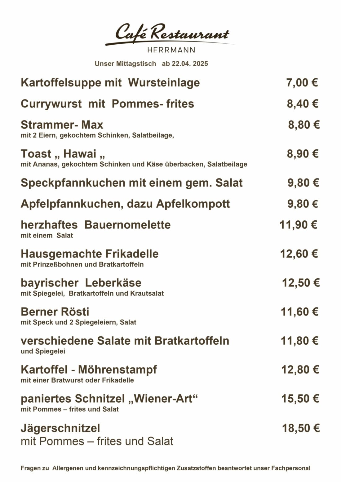 Den Restaurantbetrieb und den Mittagstisch mussten wir aufgrund enorm gestiegener Kosten, die Mwst.-Erhöhung und zunehmende Personalprobleme am 22.12.2023 einstellen.